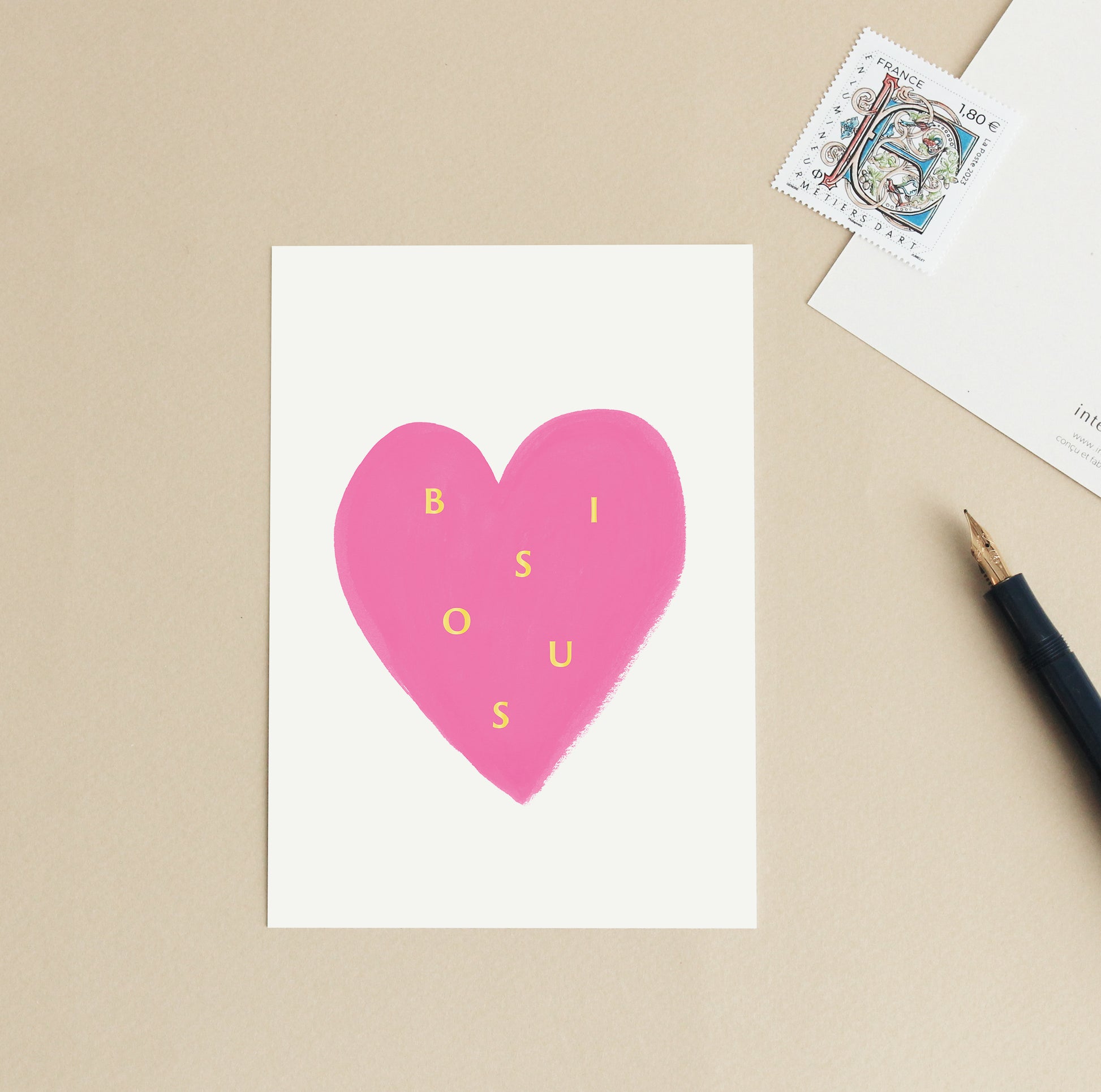 Carte d'art Coeur "Bisous"- Rose